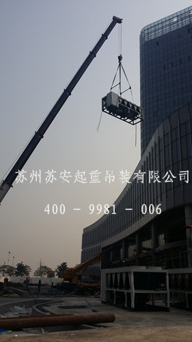 园区公积金管理中心大型空调机组吊装。空调机组最大重8吨,需吊装至10楼楼顶,由于有大型地下室,空调机组吊装时吊车无法停到大楼下,苏安吊装英亚官网首页(中国)官方网站根据现场情况,安排了一台200吨吊车并制定出了一套安全可行的设备吊装方案。2天时间8台空调机组顺利吊装定位。